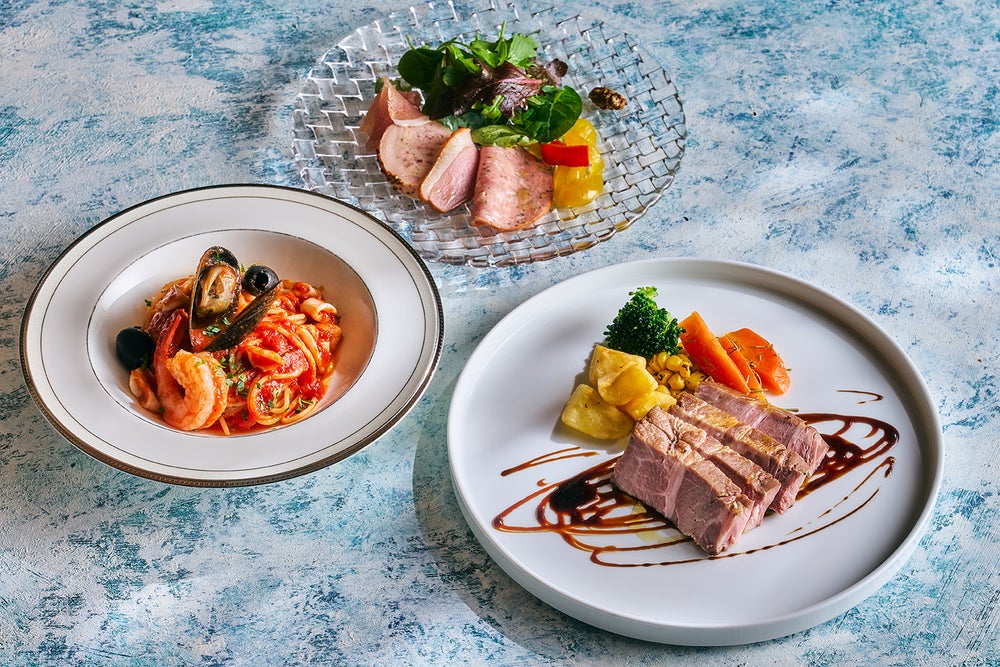 前菜、パスタ、メインディッシュに加えて、軽食を食べ放題でお召し上がりいただけるライトミールバー付きの『サマーナイトディナー』を開催。和牛ステーキ食べ放題メニューと、魚料理・肉料理から選べるセレクトメインディッシュメニューの2種類から、お客様のお好みに合わせてお選びいただけます。
