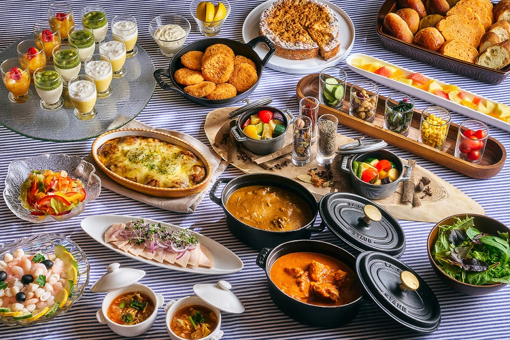 | 〔冷製料理〕 シーフードのシトラスマリネ、チキンハムとオニオンのマリネ、彩り野菜の和風ラッペ、サラダ各種、 フルーツ、パン各種 〔温製料理〕 カレーセレクション(バターチキンカレー/マイルドビーフカレー)、ライス、ロースト野菜とスパイス各種、 本日の温製スープ、クリームコロッケ、照り焼きミートグラタン 〔デザート〕 マンゴープリン、パンナコッタ キウイソーズス掛け、オレンジとパッションフルーツのゼリー、 アップルシナモンケーキ 〔飲み物〕 コーヒー、紅茶 |